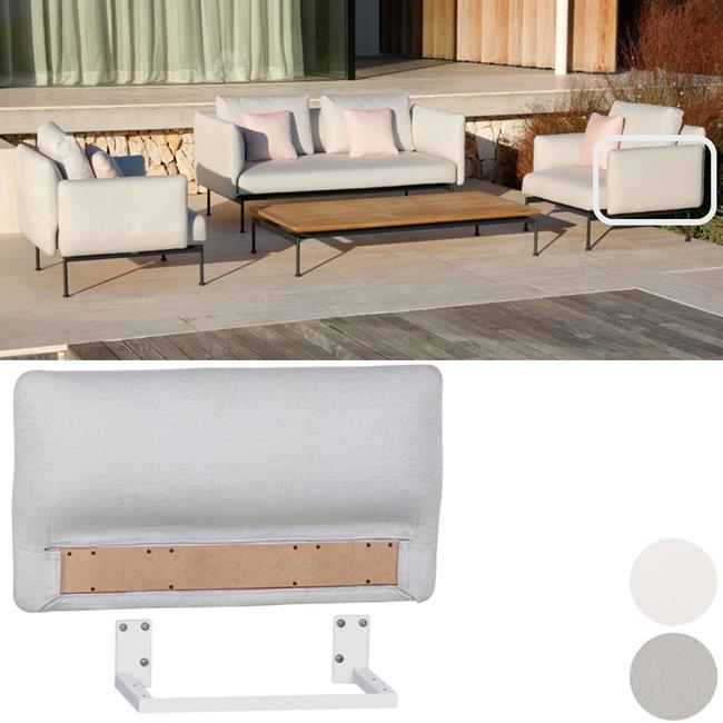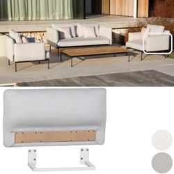 The collection comprises two sizes of upholstered seat (Single & Double Seat widths) and five tables, which together make possible intimate or grand seating corner groups, "L" or "C" Shaped outdoor lounge areas. Upholstered backs and arms are separate components and can fit on any side of the seating units to create sofas, corner sectionals, loungers, chairs, ottomans and many asymmetric configurations. The "Sunbrella" upholstered seats and teak tables use a refined frame made from stainless steel that is then powder coated in a choice of two colours Forge Grey or Arctic White.