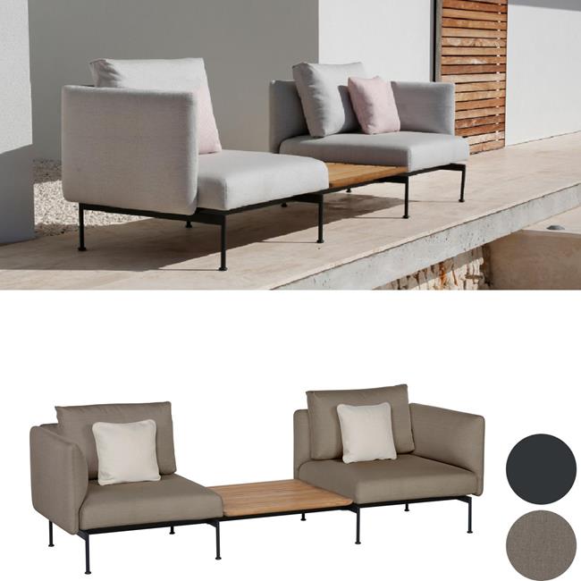 The collection comprises two sizes of upholstered seat (Single & Double Seat widths) and five tables, which together make possible intimate or grand seating corner groups, "L" or "C" Shaped outdoor lounge areas. Upholstered backs and arms are separate components and can fit on any side of the seating units to create sofas, corner sectionals, loungers, chairs, ottomans and many asymmetric configurations. The "Sunbrella" upholstered seats and teak tables use a refined frame made from stainless steel that is then powder coated in a choice of two colours Forge Grey or Arctic White.