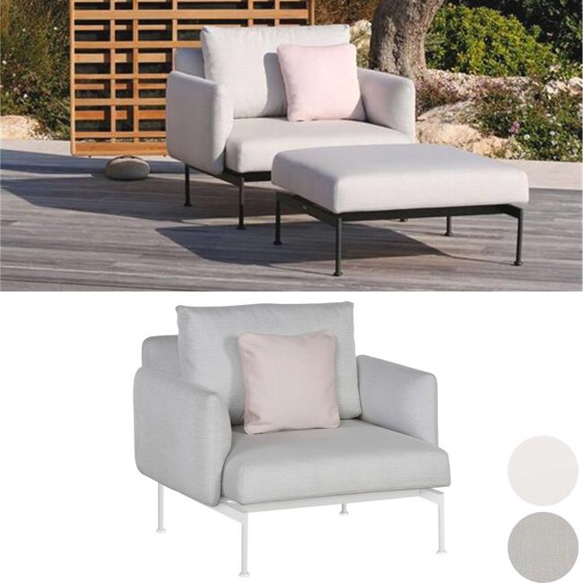 The collection comprises two sizes of upholstered seat (Single & Double Seat widths) and five tables, which together make possible intimate or grand seating corner groups, "L" or "C" Shaped outdoor lounge areas. Upholstered backs and arms are separate components and can fit on any side of the seating units to create sofas, corner sectionals, loungers, chairs, ottomans and many asymmetric configurations. The "Sunbrella" upholstered seats and teak tables use a refined frame made from stainless steel that is then powder coated in a choice of two colours Forge Grey or Arctic White.
