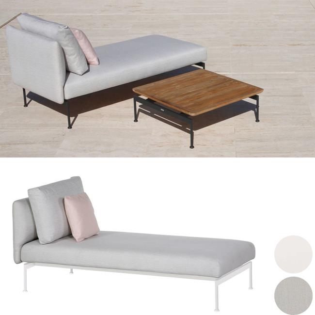 The collection comprises two sizes of upholstered seat (Single & Double Seat widths) and five tables, which together make possible intimate or grand seating corner groups, "L" or "C" Shaped outdoor lounge areas. Upholstered backs and arms are separate components and can fit on any side of the seating units to create sofas, corner sectionals, loungers, chairs, ottomans and many asymmetric configurations. The "Sunbrella" upholstered seats and teak tables use a refined frame made from stainless steel that is then powder coated in a choice of two colours Forge Grey or Arctic White.