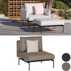 The collection comprises two sizes of upholstered seat (Single & Double Seat widths) and five tables, which together make possible intimate or grand seating corner groups, "L" or "C" Shaped outdoor lounge areas. Upholstered backs and arms are separate components and can fit on any side of the seating units to create sofas, corner sectionals, loungers, chairs, ottomans and many asymmetric configurations. The "Sunbrella" upholstered seats and teak tables use a refined frame made from stainless steel that is then powder coated in a choice of two colours Forge Grey or Arctic White.
