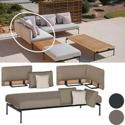 The collection comprises two sizes of upholstered seat (Single & Double Seat widths) and five tables, which together make possible intimate or grand seating corner groups, "L" or "C" Shaped outdoor lounge areas. Upholstered backs and arms are separate components and can fit on any side of the seating units to create sofas, corner sectionals, loungers, chairs, ottomans and many asymmetric configurations. The "Sunbrella" upholstered seats and teak tables use a refined frame made from stainless steel that is then powder coated in a choice of two colours Forge Grey or Arctic White.