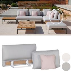 The collection comprises two sizes of upholstered seat (Single & Double Seat widths) and five tables, which together make possible intimate or grand seating corner groups, "L" or "C" Shaped outdoor lounge areas. Upholstered backs and arms are separate components and can fit on any side of the seating units to create sofas, corner sectionals, loungers, chairs, ottomans and many asymmetric configurations. The "Sunbrella" upholstered seats and teak tables use a refined frame made from stainless steel that is then powder coated in a choice of two colours Forge Grey or Arctic White.
