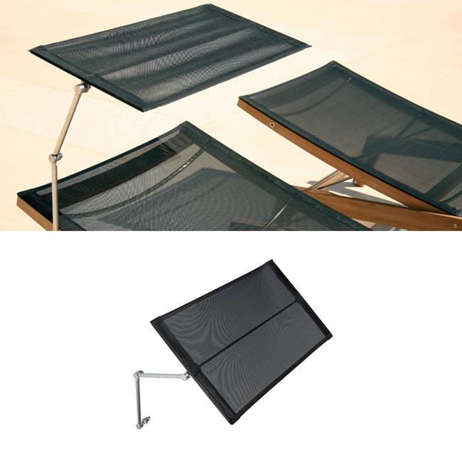 Textilene clip on lounger sun shade for Horizon and Equinox loungers. This sunshade is to protect & shade your face for easy reading etc when lying in strong sunlight and can be fitted to Barlow Tyrie Horizon or Equinox Sun Loungers, with a simple locking nut, to the hole awaiting, already in this range of loungers, all fixings supplied, a 2 minute fix.