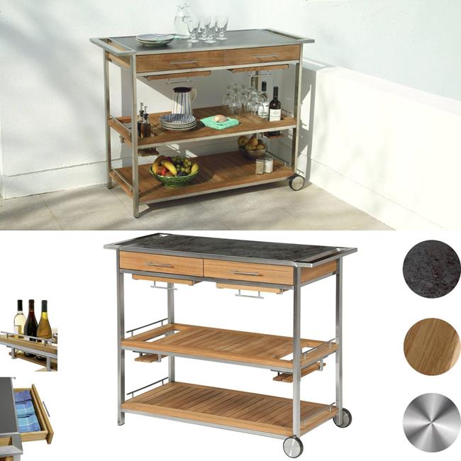 Barlow Tyrie Mercury serving tables are manufactured using the highest quality "Marine Grade" .316 Stainless Steel, resulting in a strong and attractive brushed finish frame, with an Italian ceramic scratch proof work surface in a selection of colours. The tables include Teak cutlery and accessories drawers, shelves, serving trays, bottle or condiment racks and wheels for easy re-positioning. A delightful addition to any Stainless Steel or Teak outdoor dining or lounge area.