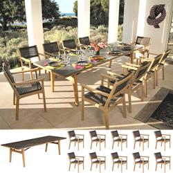 Designed by Mark Tyrie, with sculptured lines of Gorgeous plantation Teak, Monterey dining tables are available in Frost White Ceramic or Oxide - a dark mottled slate colour for the table tops. And the complimenting armchairs with either Chalk white or Brown braided cord. There is a matching range of Monterey relaxed low seating which uniquely reclines with footrest & ceramic top occasional tables