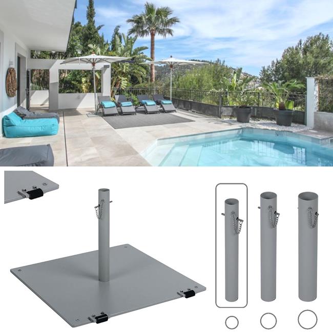 A free standing parasol base with 38mm diameter tube, designed for smaller parasols. Supplied with rollers on one edge to aid positioning.