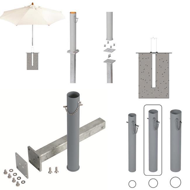 This base comprises of a 48mm tube, designed for medium sized parasols, a connection plate and a base (in this case a tube that is buried in the ground). All pieces are mild powder coated in grey.