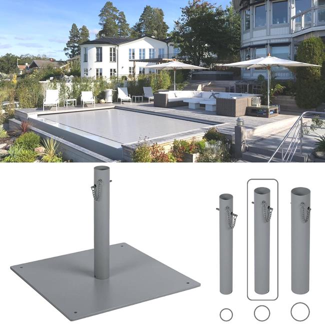 This parasol base should be attached to the ground securely before use. Holes are provided in each corner for this purpose. The base is supplied with a 48mm diameter tube, designed for medium size parasols.