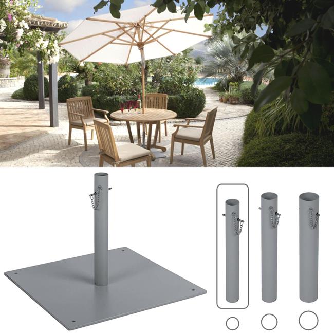 This parasol base should be attached to the ground securely before use. Holes are provided in each corner for this purpose. The base is supplied with a 38mm diameter tube, designed for smaller parasols.