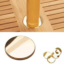 Polished Brass Parasol Hole Reducer Rings. A blanking cap fills the parasol hole in your table when used without a parasol. A reducer ring minimises movement of a parasol pole in a table top. The pole diameter of your parasol determines the correct size to use.