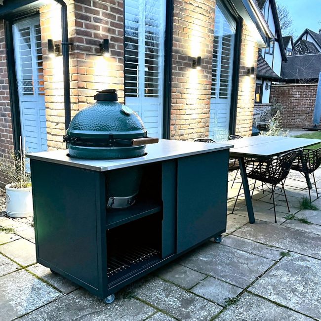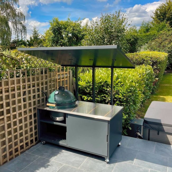 BIG4SPACE Premium quality outdoor cooking islands for your Big Green Egg ceramic grill are manufactured from electro-plated & hot-dipped galvanised steel components of the highest quality. With sliding front panels made of HPL (High Pressure Laminate) an extremely weather resistant, easy to clean material. HPL panels are frost, heat and UV resistant. And offer Extreme weather protection. Unlike solid wood, HPL is a zero-maintenance material. Abrasion, impact, scratch resistant. All metal components are powder-coated steel to protect against scratches, bleaching, heat, frost, corrosion.
