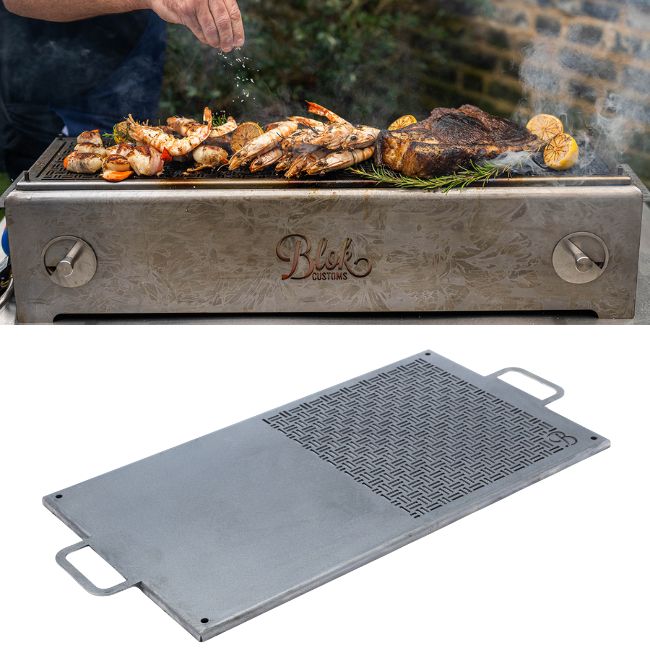 Elevate your grilling game with the Half & Half Plancha for the Blok Table Grill. Crafted from mild steel, this dual-surface plancha combiness flat griddle and laser cut grill in one sleek unit - giving you the best of both worlds.