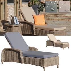 This elegant sun lounger is supplied with a top quality fully waterproof and highly stain resistant cushion, in a choice of beige or grey. So not only are the cushions sumptuous, comfortable and almost impossible to stain; there is no need to bring them in during wet weather.