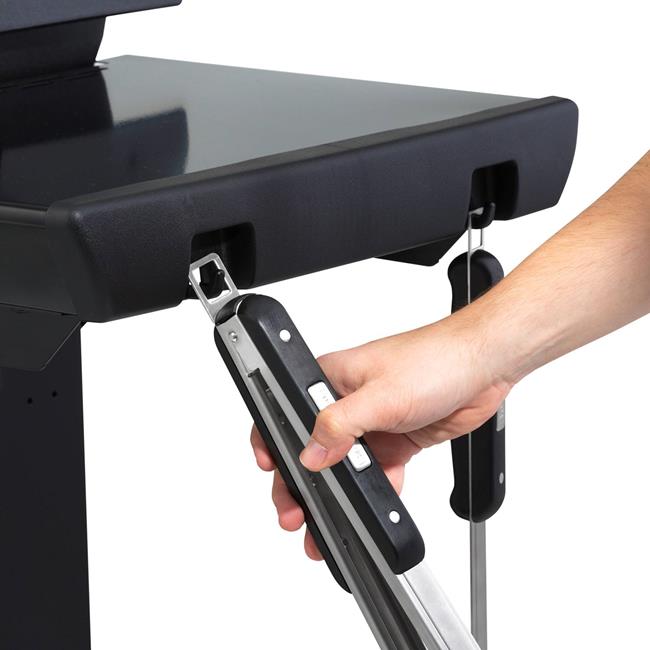 - Black powder coated steel drop-down side shelves