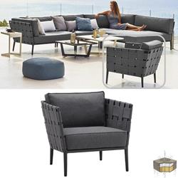 Conic lounge chair is a result of a long design process, where the designers and the craftsmen spend hours getting the frame and the cushions just right. The focus has been on a harmonious design with high comfort. The sidearm pillows provide great comfort and has references back to the classic lounge chair design. The Conic lounge chair comes with all-weather cushions allowing one to maximize the time being spent outdoors as the cushions drain fast after a rain shower. The Conic lounge chair is thought both to be used together with the other conic sofa modules in a lounge group or as stand alone chairs e.g. two lounge chairs with an One-the-Move tray table in between. The design idea behind the Conic modular sofa series has been to emphasise the possibilities of the furniture to fit in and at the same time stand out. The taupe colours and the transparent design of the Cane-line SoftTouch® material underlines this idea.