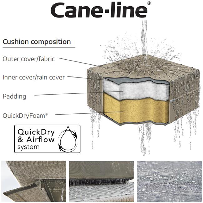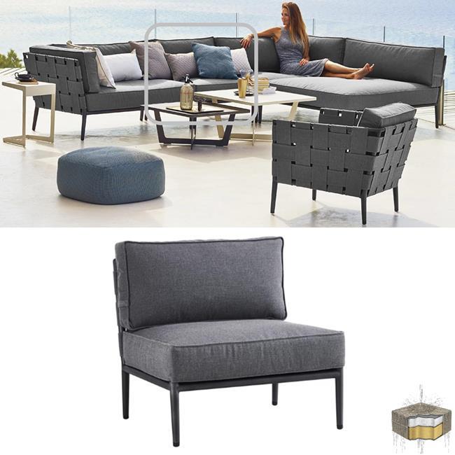 This module was designed to provide extension possibilities together with the other Conic modules. It comes with our new connection system that makes it easy to link the modules together. The single seater chair can be used as a solitaire lounge chair as well and thereby offering great opportunities if one wants to reorganise the way the modules are build together. As the other modules the single module comes with all-weather cushions that are designed for true outdoor living. For optimal draining of rain water, simply put the cushion in a vertical position, and the water will drain. The water will also drain when placed normally, yet the drainage and drying will be slower this way. The conic series is developed with great dedication to creating optimal comfort and details. The cushions are the result of many hours of work and a huge number of prototypes each tested by the designers and the Cane-line design Team. If the Conic modules are used in very humid and cold climates of the northern hemisphere, it is recommended to buy our furniture covers or store the cushions indoor in order to ease the cleaning of them for the new season. The cushions can e.g. be cleaned with a water jet (soft jet) and put in vertical position to dry.