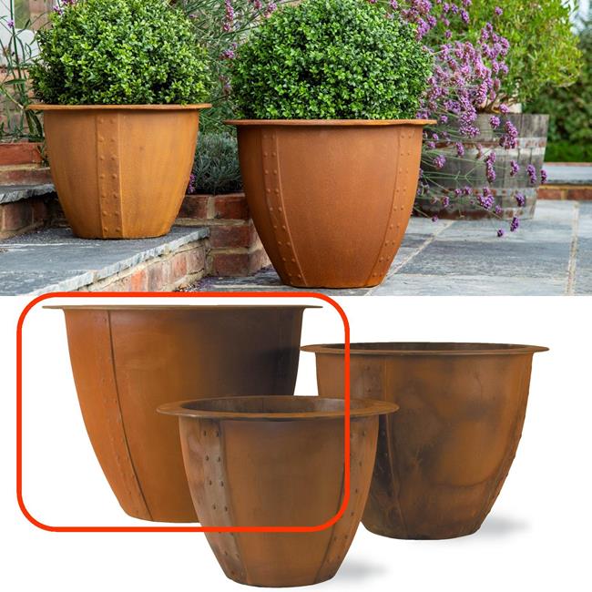 The Norman planters are a collection of three metal designs. Capital Gardens have spent a lot of time developing their first 'rust' finish to accurately replicate the appearance of rusty old metal. This rust finish has then been applied to the Norman planters, with the rust and rivets combining to make an authentic planter that looks as if it has been duf up from the garden.