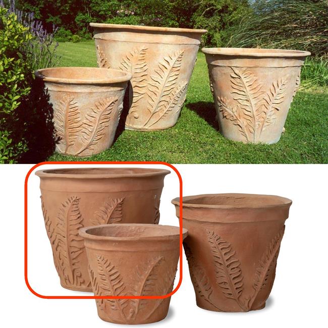 Woodland braken adorns this terracotta pot, with the pattern unfurling upwards from the base.