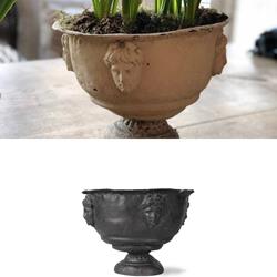This unusual little tabletop urn is cast from an antique original believed to be Jacobean and has its dents and fatigue marks. There are four devil masks, complete with horns decorating the urn.