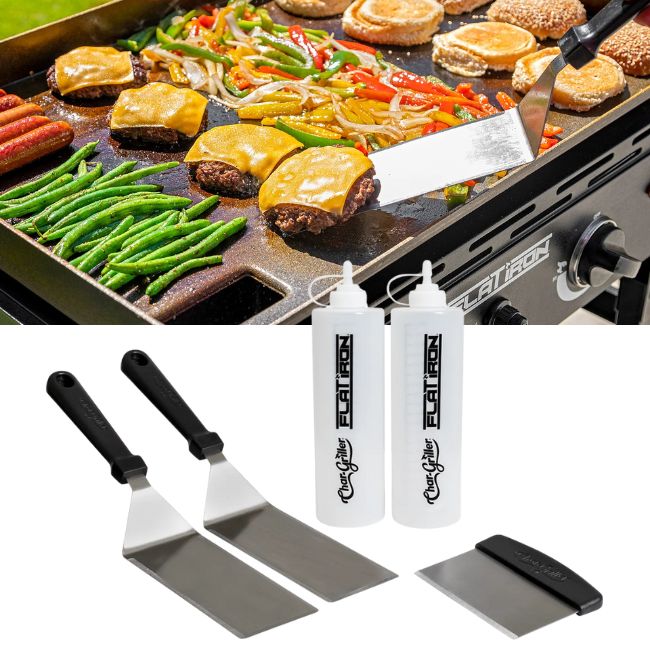 All the tools that you need to get the most out of your griddle. Great for both cooking and cleaning up. These tools will upgrade your griddle experience. Store the spatulas and the scraper on the magnetic tool storage strip on the 4 burner Flat Iron Gas Griddle!