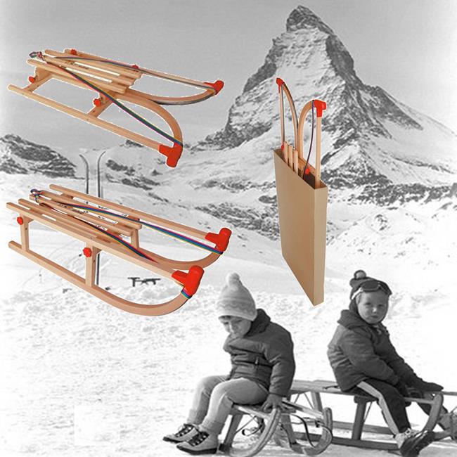 The classic 93cm FOLDING timber sledge. In 1883 the first official sled race was held in Davos, Switzerland, and so became the name Davos for this kind of traditional wooden sled, sledge or toboggan. The ultimate traditional sledge. Perfect for one rider or this model will quite happily accommodate two children as the seating slats are 59cm long. The runners at 34cm wide overall are slightly wider than the 30cm wide seat, making it very stable indeed. The 5 seat rails form a 59 x 30cm slatted seating are, and all the beech wood timber has chamfered edges making it splinter free for the kids & comfortable to hold on any section. Galvanized steel runners sit under timber bottom runners held with countersunk screws, forming a fast gliding sledge that’s easy to steer. This model has 2 pairs of support legs from the seat to the runners, 2 Red PVC end caps finish off the design where the runners curl up to meet the top frame, this protects the joint and helps you see the sledge in deep snow, and comes complete with long red pull strap. A sledge to be proud of that will provide a lifetime of winter fun for all ages.