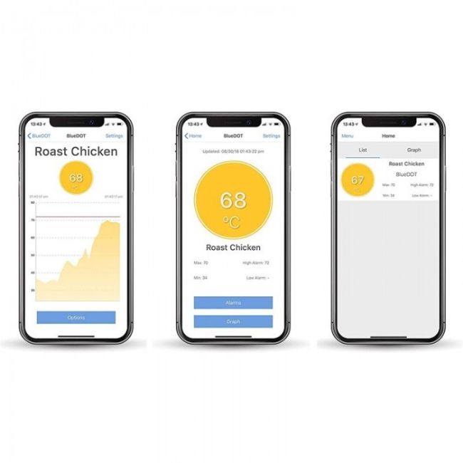 BlueDOT's Bluetooth connection allows you to track max/min temperatures and graph your cook. Simply set your temperature target with the up or down buttons, or direct from your smartphone, and the BlueDOT will beep when it gets there. Hear your alarms on the BlueDOT and your smart device with the free mobile app. The Bluetooth connection also allows you to track max / min temperatures and graph your cook.