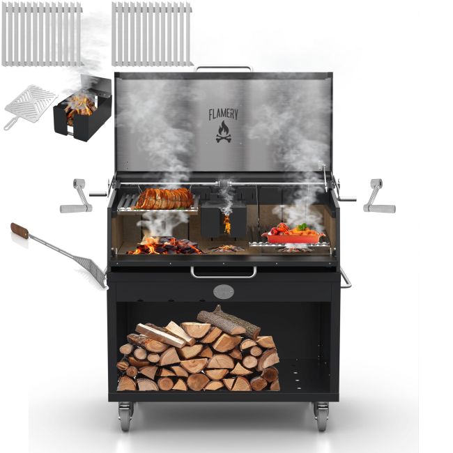 The ASADO PRO.2.2, Large Asado Grill BBQ on Trolley, is the ultimate wood-fired BBQ. Featuring an expansive cooking area of up to 100cm x 41cm, this grill is ideal for preparing multiple dishes at the same time, making it perfect for large gatherings or elaborate meals.