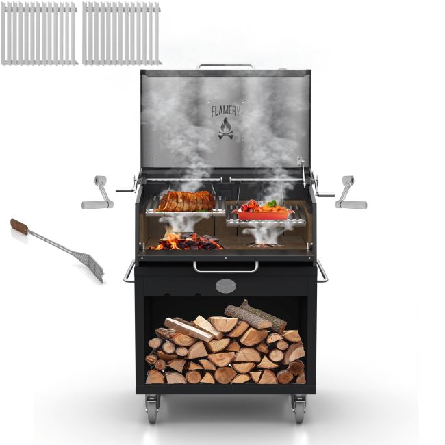 The trolley design provides the classic BBQ style with locking castors and handles for mobility. The stand has hanging hooks for BBQ tools and doubles as wood storage, ensuring you have all your grilling essentials within easy reach.