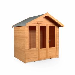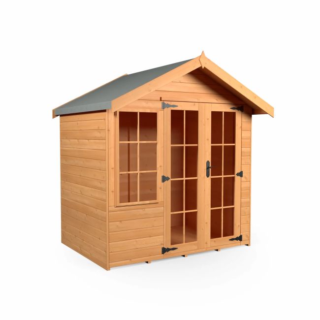 A compact apex roof summerhouse with Georgian style doors and windows and thicker than average tongue and grooved shiplap cladding. The 1200 x 1800mm joinery made doors are fitted with a mortice lock, decorated hinges and handles. The roof has a 300mm overhang.