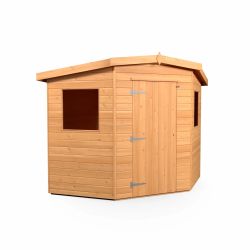 A five sided building suitable for placing in a corner. Manufactured in thicker than standard 15mm tongued and grooved shiplap on 45mm x 34mm planed framework. The door is 790mm x 1750mm framed and braced with a lock and key and hung on three galvanised tee hinges.