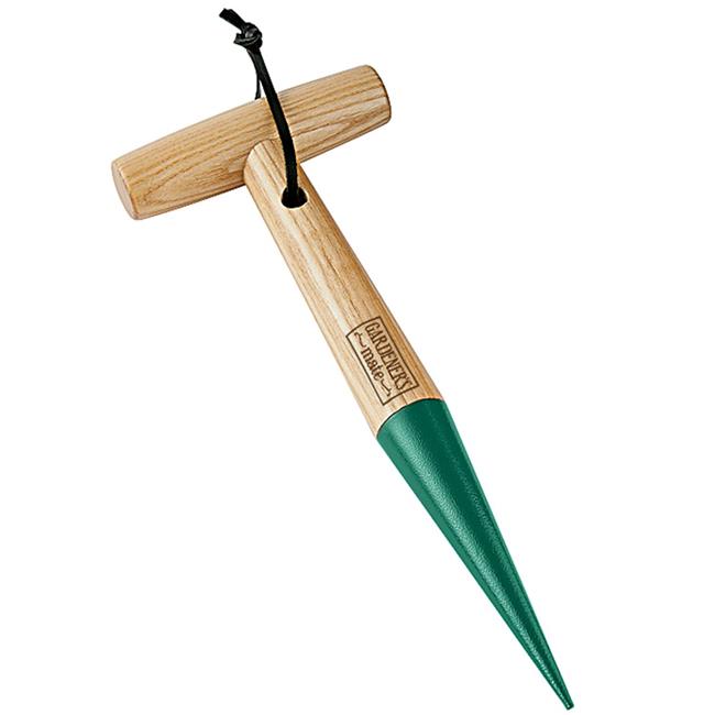 Makes transplanting holes in compost in soil. Ergonomic T-shaped FSC certified handle for better grip with black leather strap. Heat treated carbon steel head. Hammer finished head for greater resistanc to scratches, rust and alkaline in the soil.