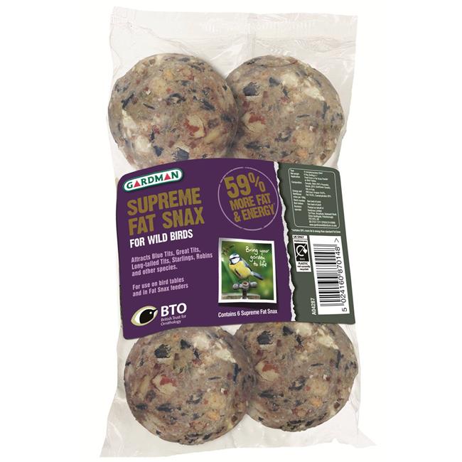 A high energy suet, cereal and seed mix shaped into a ball. The Supreme contains 59% more energy and fat than standard fat snax. Suitable for use in fat snax feeders, on bird tables and ground feeding.