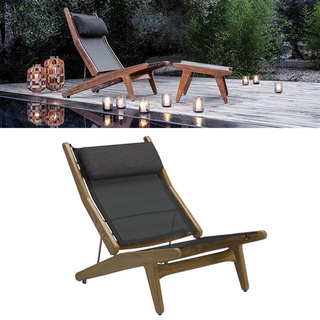 Sleek, contemporary reclining chairs for elegant relaxation. With the frame in buffed teak and the seat and back in Sling, the chairs are beautiful enough to be used inside as well as outside.