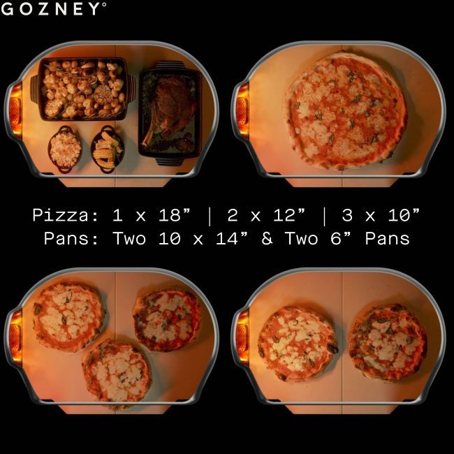Room for three 10” pizzas, two 12" pizzas, one 18” pizza or three full roasting trays.