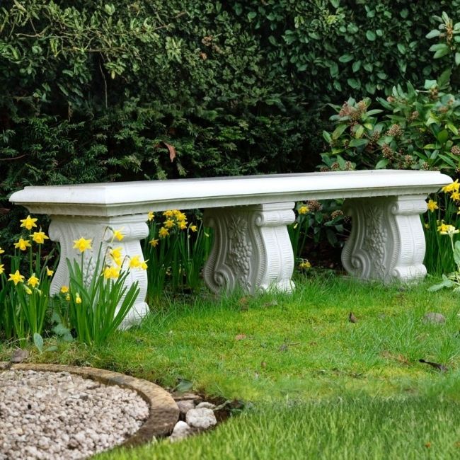 This garden seat features a simple curved design and includes three scrolled seat support. It makes a lovely resting spot on a terrace or in a courtyard or garden.