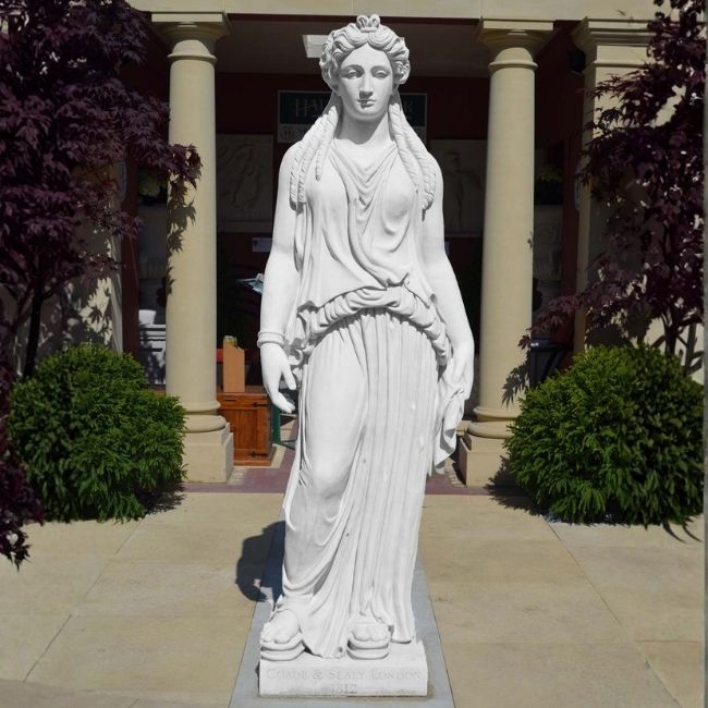 This would have been one of the last designs created during John Sealy's lifetime as he died in 1813. A pair of these female figures stand on top of the projecting stone façade of Soane's house in Lincoln's Inn Fields. The original Coade caryatid design was based on ancient Greek sculptures at the Erechtheion temple on the Acropolis in Athens, where the caryatids support an entablature. Coase modified the design to create a magnificent free-standing figure.