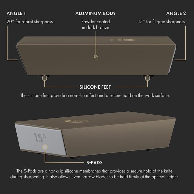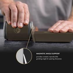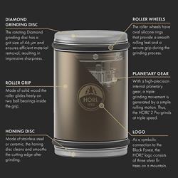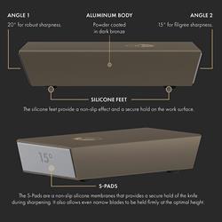HORL 2 Pro is the masterwork of Otmar and Timo Horl. Made of aluminium and stainless steel, the planetary gearing inside provides a transmission ratio of 1:3. Compared to our other HORL 2 models, it effectively achieves the desired sharpness three times as fast. With high-quality stainless steel and aluminium components as well as the dark bronze powder coating give this premium knife sharpener an elegant look and at the same time a unique feel.