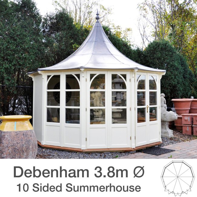 The Debenham is a very spacious design, thanks to the ten sided decagon shape, retaining the Victorian look and feel of the popular Lavenham Summerhouses, with the same attention to detail. From fluted posts to arched tracery, every aspect of its design creates a structure fit to command a place in the finest of gardens.