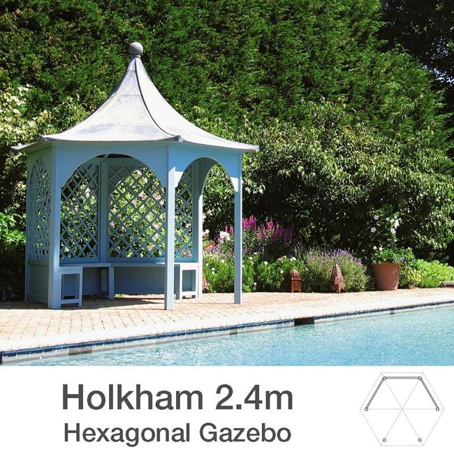 Hexagonal in shape, incorporating three open sides and three solid or trellised options, the Holkham Gazebo might be found tucked away in a private leafy part of the garden or placed as an elegant centre piece around which the garden can be created. Either way it is designed as an airy yet sheltered space from which to enjoy being in the garden.