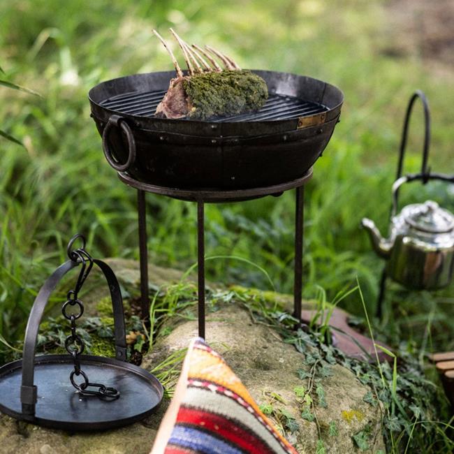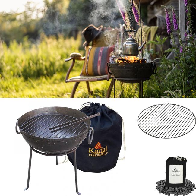 The Kit Includes: Recycled Travel Kadai Firebowl, Stand, Grill, Tongs, Cotton Duffle Bag and 2.5L Kadai Beads.