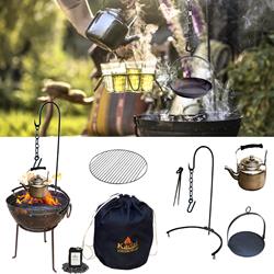 Package Includes: 40cm Travel Firebowl | Stand | Travel Hook & Chain | Travel Kettle | Travel Skillet | Cooking Grate | Tongs | Cotton Duffle Bag Carry Case | 2.5 Litres of Kadai Beads