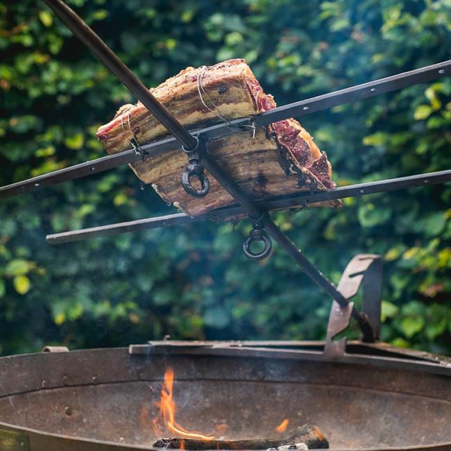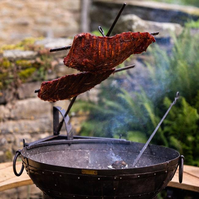 This hand-crafted, steel Asado Cross is a meat-lovers ideal piece of cookware. It has two adjustable arms that keep your meat secure, with the added bonus of four meat hooks. The Kadai Asado Cross fits best onto a 70cm or 80cm Firebowl and has a useful stand that allows you to place it closer or further away from your flame.