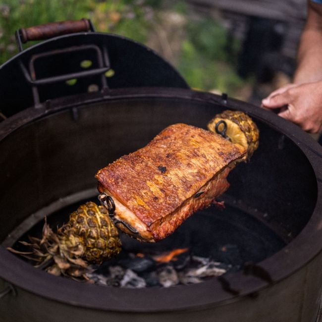 Elevate your Kadai cooking experience with the BBQ Rotisserie Kit, perfect for slow-cooking large joints of meat over an open fire or hot coals. The Rotisserie drum sits on your Kadai Fire Pit and locks into place on the Gothic High Stand. The double-pronged clamps hold the food in place on the stainless steel rotisserie spit, which sits inside the BBQ Rotisserie Kit. This spit can be rotated and then dropped into the locking slot for controlled cooking. The BBQ Rotisserie Kit works perfectly with the BBQ Smoker Lid for an even cook.