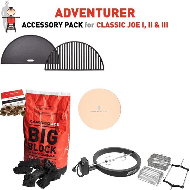 ![]() 7pc Adventurer Accessory Pack (For Classic Joe) 1 No. Kamado Joe Charcoal 9kg Bag 1 No. Pack of 24 Firestarters 1 No. Cast Iron Griddle (Reversible) 1 No. Cast Iron Grate 1 No. Pizza Stone 1 No. JoeTisserie & Motor 1 No. JoeTisserie Basket Kit Availability: IN STOCK Product Code: ADVPACKC |