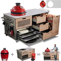 We are delighted to introduce KAMADO SPACE.. Outdoor Kitchen Islands for any Kamado Ceramic Grill | Smoker | Pizza Oven Designed & manufactured with love, these units are seriously engineered with the finest materials. Made for a perfect fit with your chosen or existing Kamado. Simply select the model and we will supply the corresponding stainless steel worktop, with the correct size and shape aperture. Kamado Joe | Primo | Big Green Egg. The hinge cut outs are all accounted for, and you can adjust the height for the perfect working height, and compatibility with rotisserie accessories. There's even an integral ash bin with lid, slide up ventilated access door, bottle opener and shelving & drawers to house all you cooking grates and charcoal. Read more...