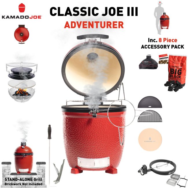 ![]() Classic Joe III (3) Stand-Alone With 8pc Adventurer Pack Inc. Cover & Charcoal + Firestarters + Cast Iron Griddle + Cast Iron Grate + Pizza Stone + JoeTisserie & Motor + JoeTisserie Basket Kit Availability: IN STOCK Product Code: KJC3SOADV |