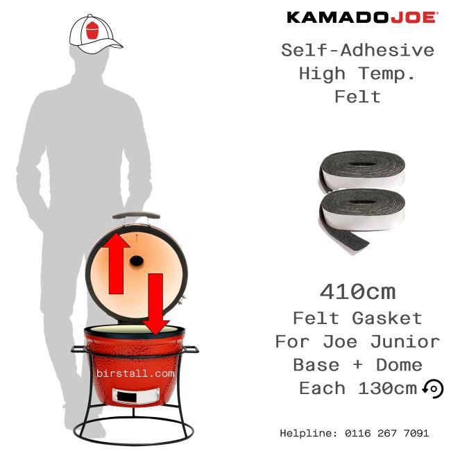 Replacement felt gasket kit to fit Joe Junior, Classic I, II & II Kamado Joe models. Self-adhesive for easy replacment of old worn out greasy gaskets. Kit is supplied as ONE Long 410cm length with enough for the lower base and top dome lid, simply cut to length