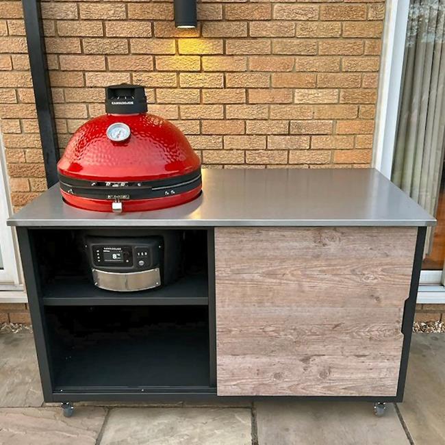 We are delighted to introduce KAMADO SPACE.. Outdoor Kitchen Islands for any Kamado Ceramic Grill | Smoker | Pizza Oven Designed & manufactured with love, these units are seriously engineered with the finest materials. Made for a perfect fit with your chosen or existing Kamado. Simply select the model and we will supply the corresponding stainless steel worktop, with the correct size and shape aperture. Kamado Joe | Primo | Big Green Egg. The hinge cut outs are all accounted for, and you can adjust the height for the perfect working height, and compatibility with rotisserie accessories. There's even an integral ash bin with lid, slide up ventilated access door, bottle opener and shelving & drawers to house all you cooking grates and charcoal. Read more...