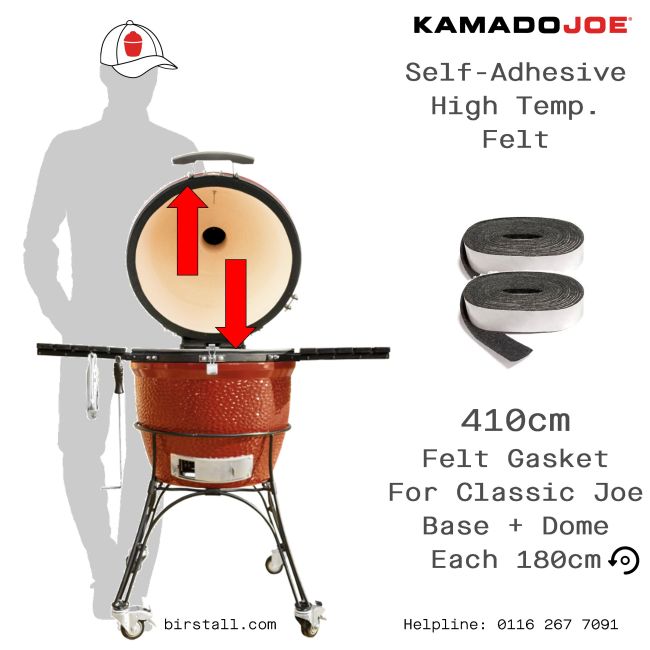 Replacement felt gasket kit to fit Joe Junior, Classic I, II & II Kamado Joe models. Self-adhesive for easy replacment of old worn out greasy gaskets. Kit is supplied as ONE Long 410cm length with enough for the lower base and top dome lid, simply cut to length
